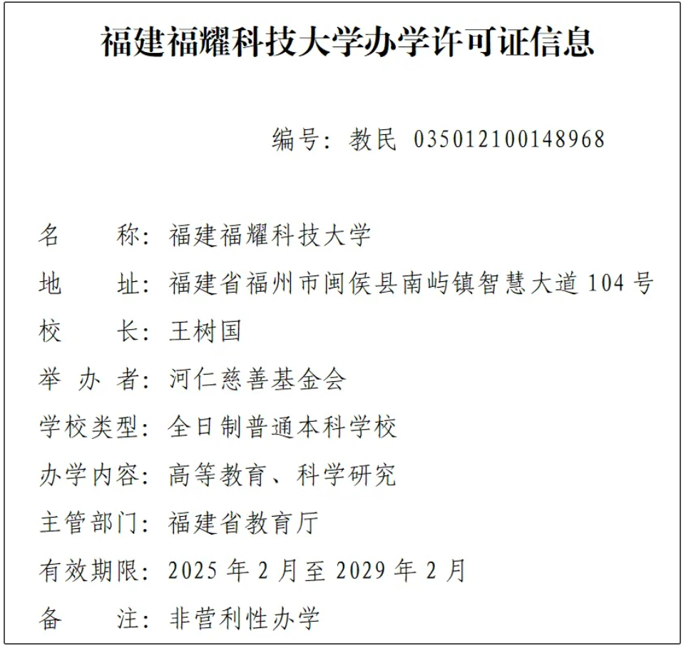《福建省人民政府關於申請設置福耀科技大學的函》(閩政函〔2024〕48號)和《福建省教育廳關於將擬設置新型研究型大學校名調整為福建福耀科技大學的請示》(閩教發〔2025〕1號)收悉。根據《中華人民共和國高等教育法》《中華人民共和國民辦教育促進法》《中華人民共和國民辦教育促進法實施條例》《普通高等學校設置暫行條例》有關規定以及第八屆全國高等學校設置評議委員會評議結果,經教育部黨組會議研究決定,同意設置福建福耀科技大學,學校標識碼為4135014896。現將有關事項函告如下。