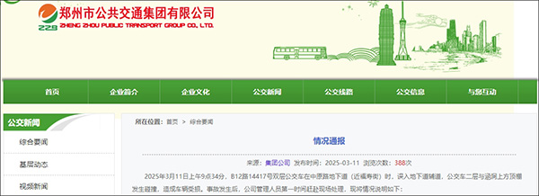 據河南鄭州公交網消息,鄭州公交集團3月11日發佈情況通報稱,當天上午9點34分,B12路14417號雙層公交車在中原路地下道(近福壽街)時,誤入地下道輔道,公交車二層與涵洞上方頂棚發生碰撞,造成車輛受損。