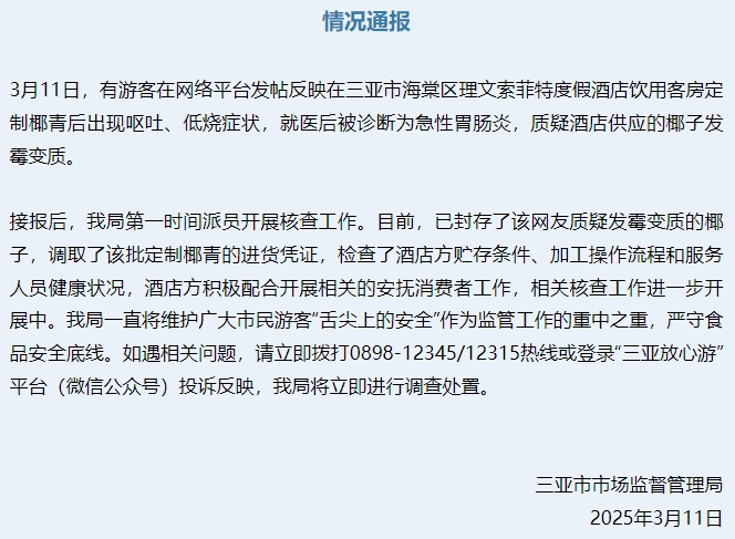 微信公眾號“三亞市市場監督管理局”3月11日發佈情況通報稱,當天,有遊客在網絡平台發帖反映在三亞市海棠區理文索菲特度假酒店飲用客房定製椰青後出現嘔吐、低燒症狀,就醫後被診斷為急性胃腸炎,質疑酒店供應的椰子發黴變質。