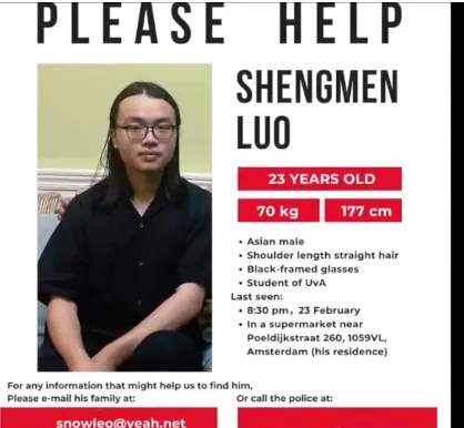 有網友在社交媒體上發佈尋人消息稱,23歲的男學生羅生門在阿姆斯特丹失聯多日,其本科畢業於清華大學哲學系,於2024年8月到阿姆斯特丹邏輯語言計算研究院攻讀碩士。