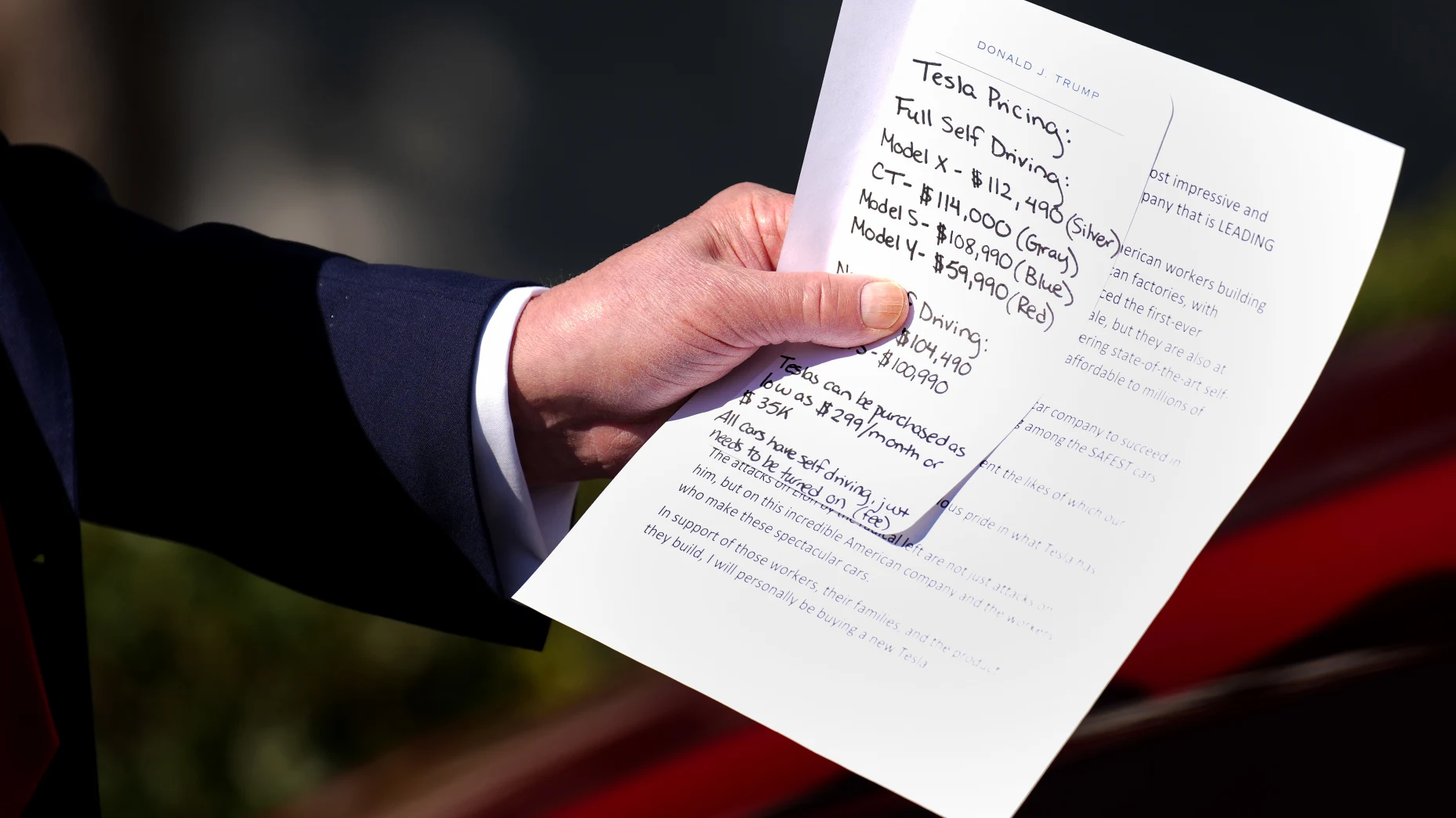 在活動現場,馬斯克還為特朗普準備了一張手寫的“特斯拉產品説明”,上面列舉了各個車型的價格和功能。根據圖片,這張説明上還提及了“特斯拉可低至299美元/月購車”、“所有車型均具備自動駕駛功能”。