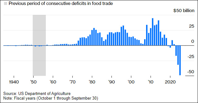 2025年,美國農業大宗商品貿易將連續第三年出現年度逆差,這將是近70年來的首次。 彭博社製圖