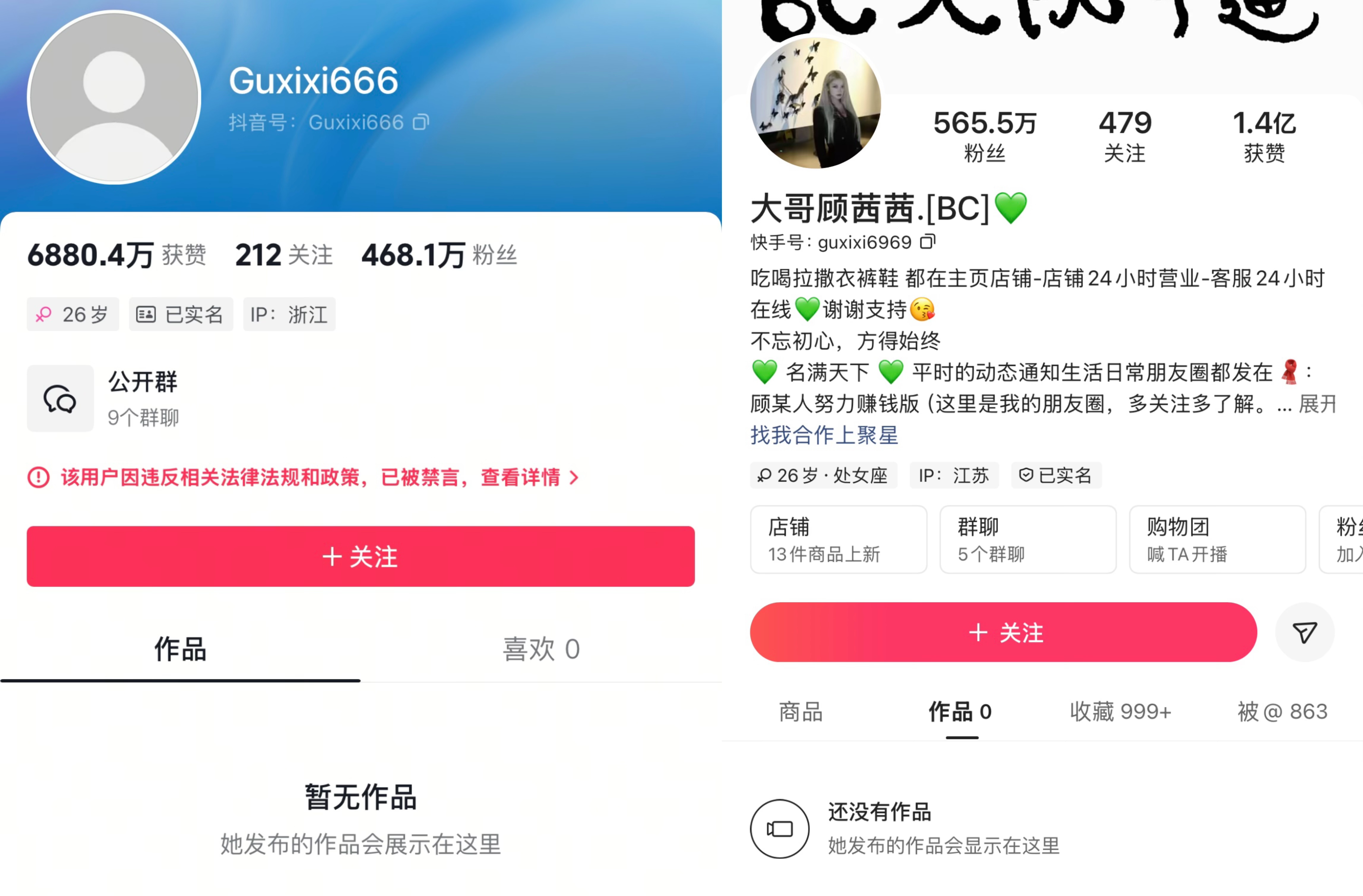 3月12日,擁有近500萬粉絲的主播顧茜茜,抖音賬號被正式永久封禁。觀察者網查詢抖音發現,目前顧茜茜賬號已無法正常顯示,頭像恢復為默認的灰色小人。而在快手平台,顧茜茜賬號顯示沒有任何作品。