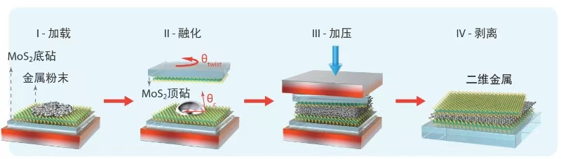 如何把金屬材料也能做得這麼薄呢?這在科學界極具挑戰性。中國科學院物理研究所張廣宇研究員帶領團隊發展了原子級製造的範德華擠壓技術。這種技術採用的壓砧是原子級平整、表面無懸掛鍵的材料。科研團隊通過將金屬熔化並利用團隊前期製備的高質量單層二硫化鉬範德華壓砧擠壓,實現了原子極限厚度下鉍、錫、鉛等二維金屬的普適製備。二維金屬的實現超越了當前二維範德華層狀材料體系,補充了二維材料家族的一大塊拼圖。