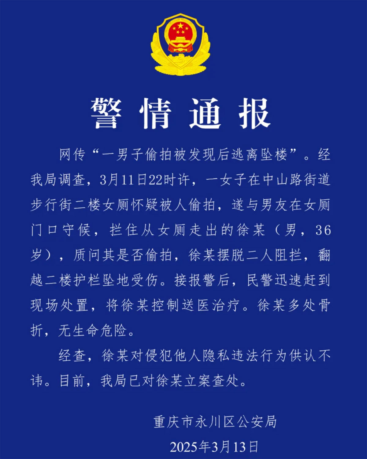 “男子在女廁所偷拍逃跑時墜樓”,重慶警方通報