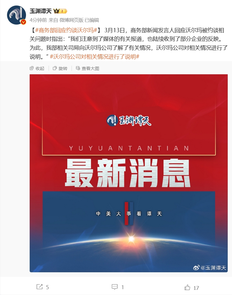 商務部回應約談沃爾瑪 guancha 2025-03-13 @玉淵譚天 消息,3月13日,商務部新聞發言人回應沃爾瑪被約談相關問題時指出:“我們注意到了媒體的有關報道,也陸續收到了部分企業的反映。為此,我部相關司局向沃爾瑪公司瞭解了有關情況,沃爾瑪公司對相關情況進行了説明。”