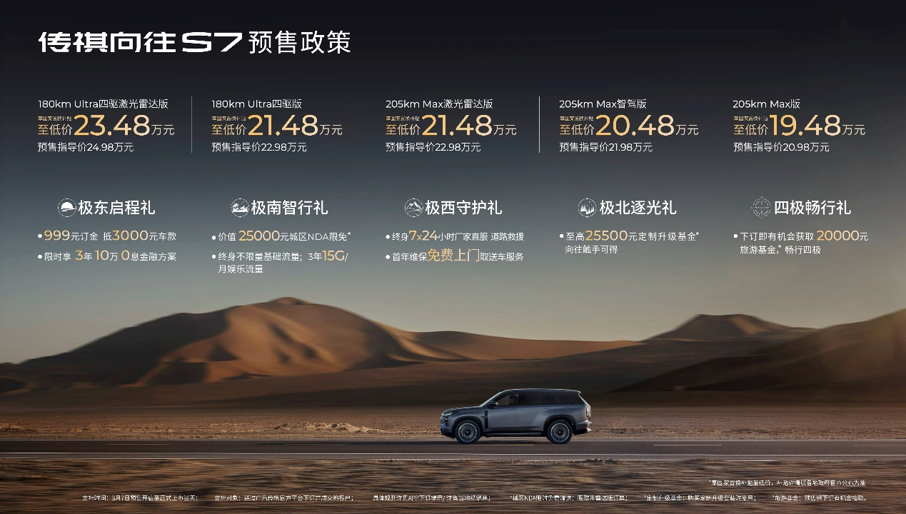 傳祺嚮往S7的預售價格為20.98萬至24.98萬元。新車高階智駕功能包含在車價中,帶激光雷達的車型贈送價值2.5萬元城市NDA智駕功能終身使用權。