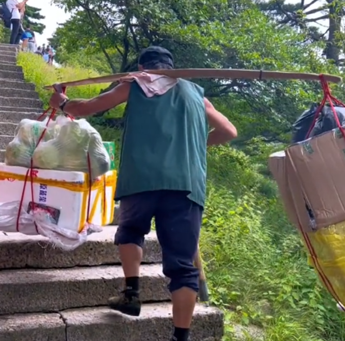 黃山,位於安徽省黃山市境內。作為中國名山,黃山由奇松怪石所構成的山脈固然雄奇壯麗,但複雜的地形也給黃山上的物資配送造成了極大的困難。 黃山的物資運送需要,衍生出“挑山工”這一職業,黃山挑山工是黃山風景區內從事物資運輸工作的特殊工種,他們肩負着將山下物資挑到山上的重任,為遊客在山上的生活提供保障。挑山工平均年齡55歲以上,老齡化嚴重。一位挑山工每天要走14至16公里的山路,邁3萬多級台階,一年下來路程超過3000公里。黃山山路曲折、陡峭,且天氣變化無常,挑山工需要在這樣的環境下負重前行,還要應對大風、暴雨、暴雪等惡劣天氣。
