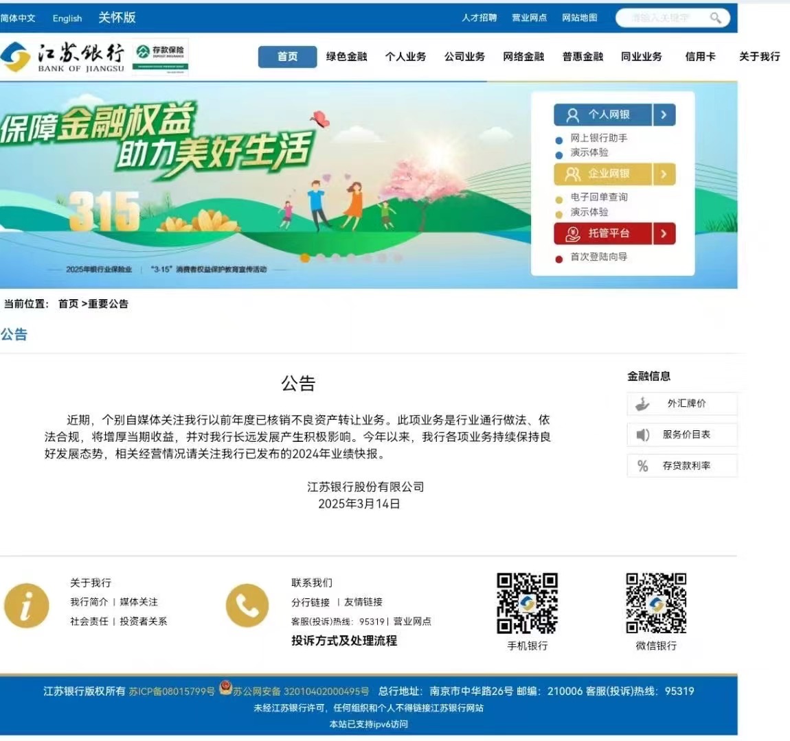 3月14日,江蘇銀行在官網針對70億不良資產出清回應稱,“此項業務為行業通行做法、依法合規,將增厚當期收益,並對該行長遠發展產生積極影響。”
