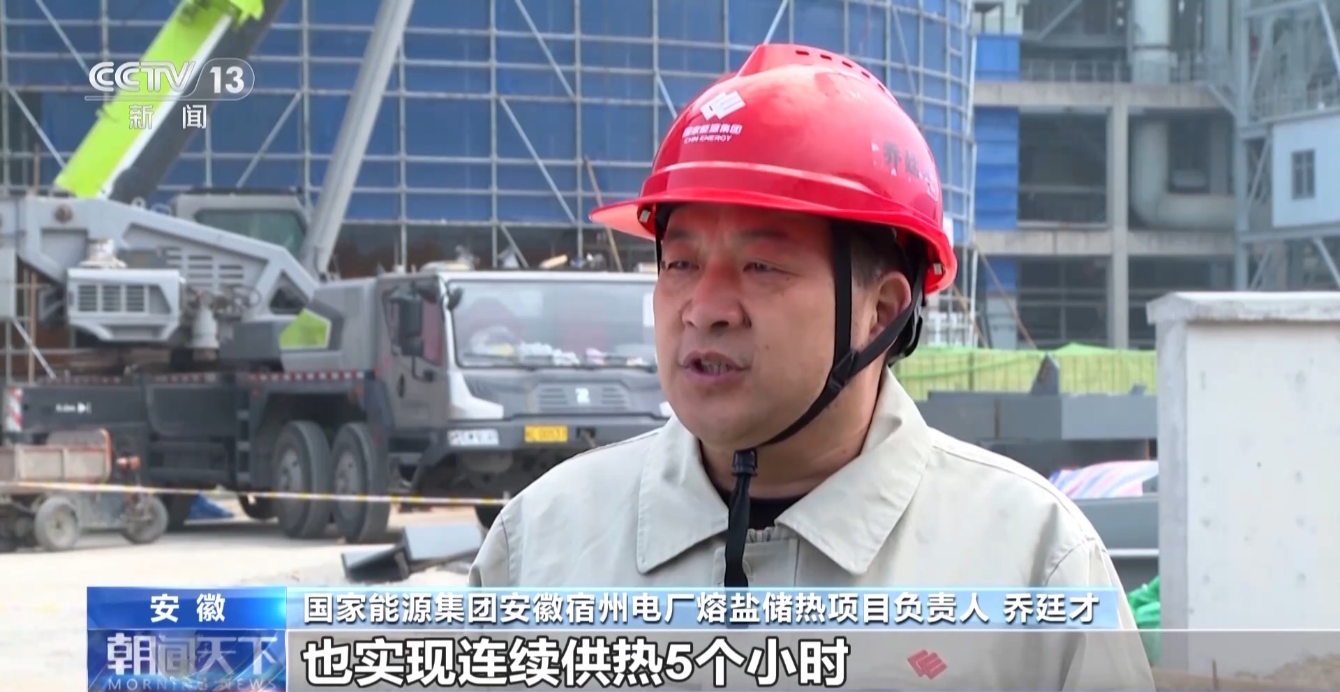 國家能源集團安徽宿州電廠熔鹽儲熱相關負責人喬廷才:這個項目建成後,我們電廠能夠實現機組滿額負荷連續供熱4小時,在深度調峯30%額定負荷下實現連續供熱5小時,同時對外供熱能力達410噸/小時,比原來供熱能力提高了260噸/小時。