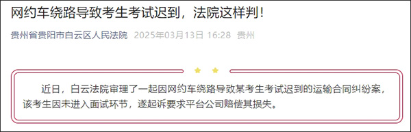 據微信公眾號“貴州省貴陽市白雲區人民法院”3月13日消息,近日,白雲法院審理了一起因網約車繞路導致某考生考試遲到的運輸合同糾紛案,該考生因未進入面試環節,遂起訴要求平台公司賠償其損失。