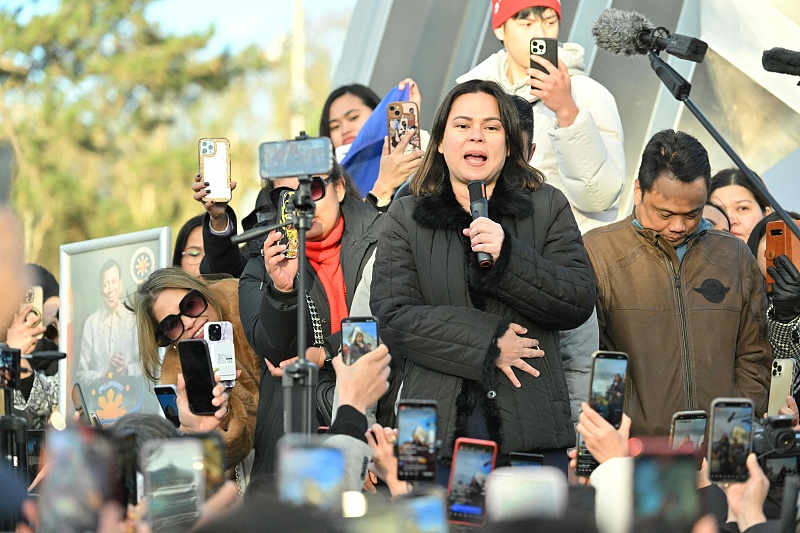 菲律賓副總統薩拉·杜特爾特在海牙國際刑事法院外向聚集的民眾發表講話,數千人聚集在此,支持她的父親。 視覺中國