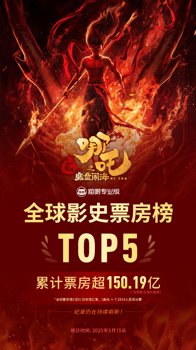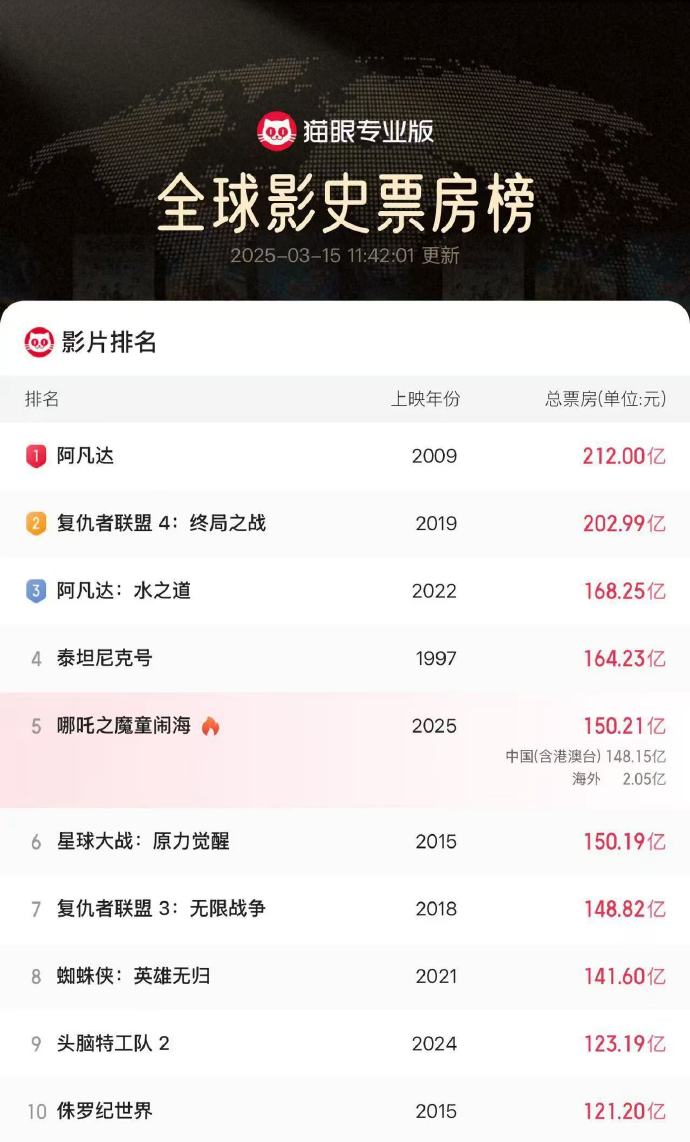 《哪吒2》,全球前5! guancha 2025-03-15 據@貓眼專業版 3月15日消息,《哪吒之魔童鬧海》累計票房(含海外及預售票房)超150.19億,超《星球大戰:原力覺醒》票房成績,衝進全球票房榜前5。