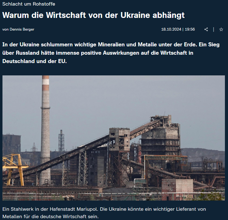 2023年9月,德國電視二台就曾發表過一篇題為《烏克蘭的礦產資源——也是為了原材料而戰》的文章,指出烏克蘭豐富的礦產資源可能既是俄羅斯經濟上的收益,也是戰略上的權力工具。《焦點》雜誌(Fokus)甚至將烏克蘭描述為一個“寶庫”,認為普京試圖通過吞併將其據為己有。