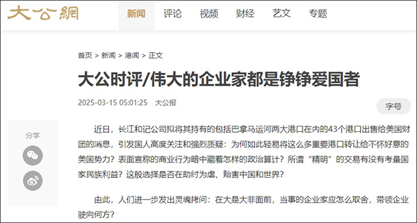 3月15日,香港《大公報》發佈題為“偉大的企業家都是錚錚愛國者”的時評,就李嘉誠旗下香港長江和記實業有限公司擬將包括巴拿馬運河兩大港口在內的43個港口出售給美國財團的消息提出5個問題。