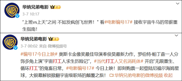 到了中國內地,宣傳文案變成了“宇宙打工人求生歷險記”“當代打工人又名消耗體”“大銀幕觀賞宇宙打工牛馬的日常工作”,看着感覺很心酸。