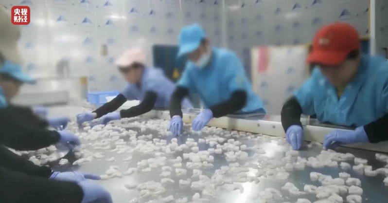 在中青海洋水產的生產現場,記者目睹了泡完藥的蝦仁後續加工流程。剛從桶裏撈出的蝦仁,直接被送上包冰機的傳送帶,迅速進入冰凍環節,眨眼間就裹上了一層冰衣。