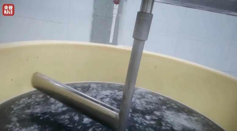 這家企業工作人員告訴記者,保水百分之二十,意味着蝦仁吸收水分之後體積變大,重量增加了百分之二十。走進企業的生產車間,地面上並排放着幾個黃色大桶,桶裏青黑色液體中攪拌的正是泡藥的蝦仁。