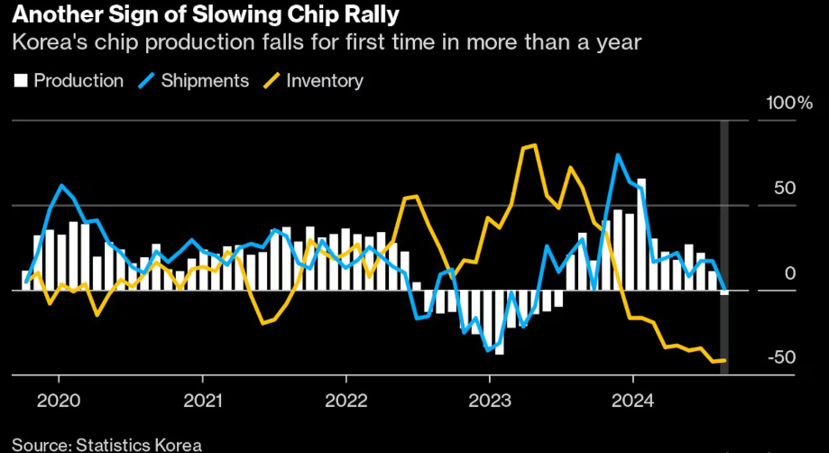 白色柱狀圖代表半導體產量,藍色線性圖代表發貨量,黃色線性圖代表庫存
