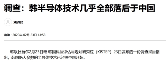 而且這還沒考慮到韓國的技術優勢已經所剩無幾,韓國科技評估與規劃研究院(KISTEP)2月23日發佈的一份調查報告指出,韓國絕大多數的半導體技術已經被中國趕超。研究院針對39名國內專家實施問卷調查的結果顯示,截至去年,韓國所有半導體領域的基礎力量均落後於中國。