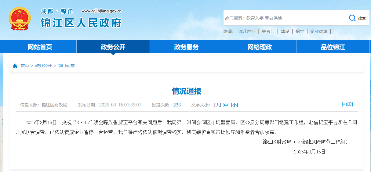 2025年3月15日,央視“3·15”晚會曝光借貸寶平台有關問題後,我局第一時間會同區市場監管局、區公安分局等部門組建工作組,赴借貸寶平台所在公司開展聯合調查,已依法責成企業暫停平台運營。我們將嚴格依法依規調查核實,切實維護金融市場秩序和消費者合法權益。