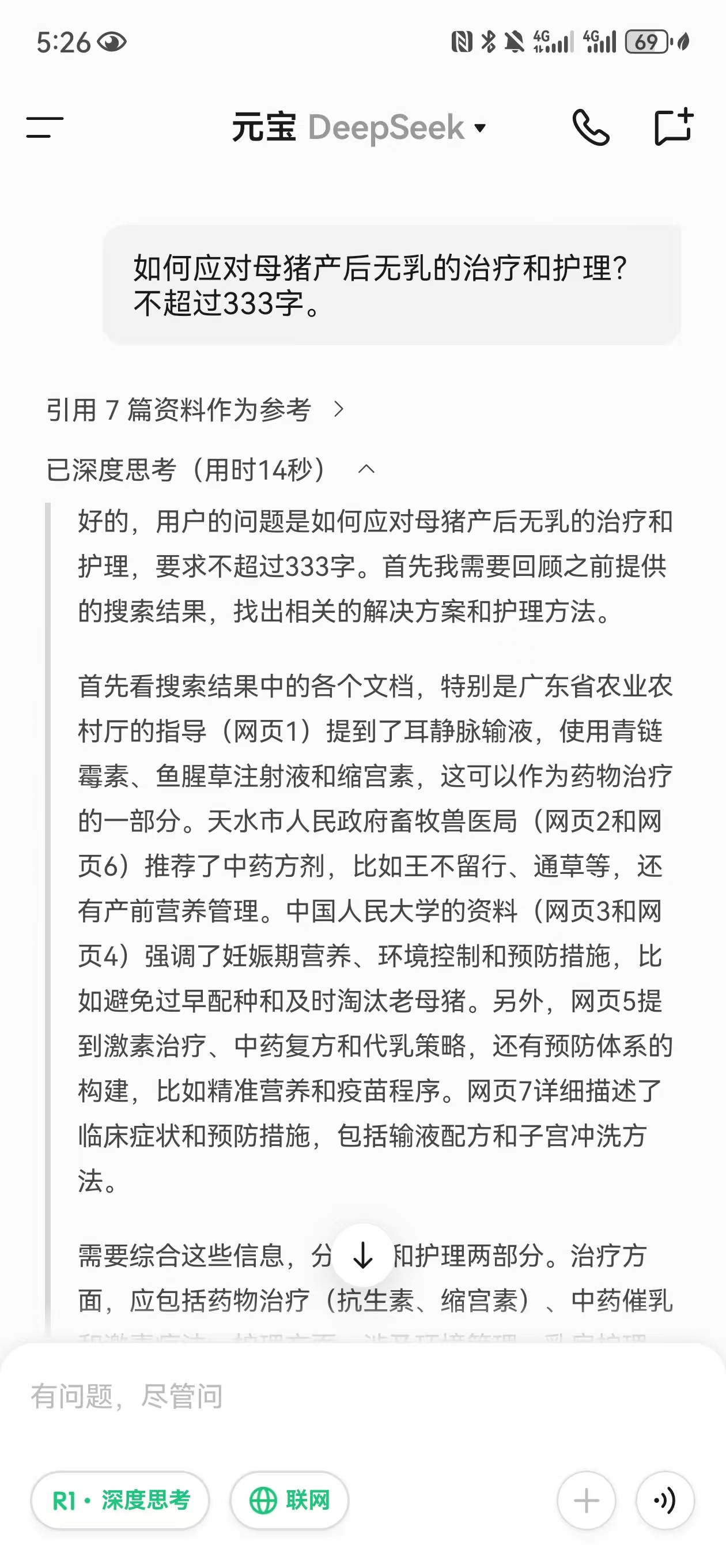 2020年3月,廣東省農業農村廳曾發表文章,2020年3月,廣東省農業農村廳曾發表文章,引用“養豬信息網”的內容,介紹“如何應對母豬產後無乳的治療和護理”,全文共333字。我們用同樣的問題、同樣的字數要求,向DeepSeek(使用騰訊元寶入口)、豆包、夸克和Kimi進行提問。