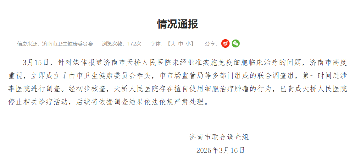 3月15日,針對媒體報道濟南市天橋人民醫院未經批准實施免疫細胞臨牀治療的問題,濟南市高度重視,立即成立了由市衞生健康委員會牽頭,市市場監管局等多部門組成的聯合調查組,第一時間赴涉事醫院進行調查。經初步核查,天橋人民醫院存在擅自使用細胞治療腫瘤的行為,已責成天橋人民醫院停止相關診療活動,後續將依據調查結果依法依規嚴肅處理。