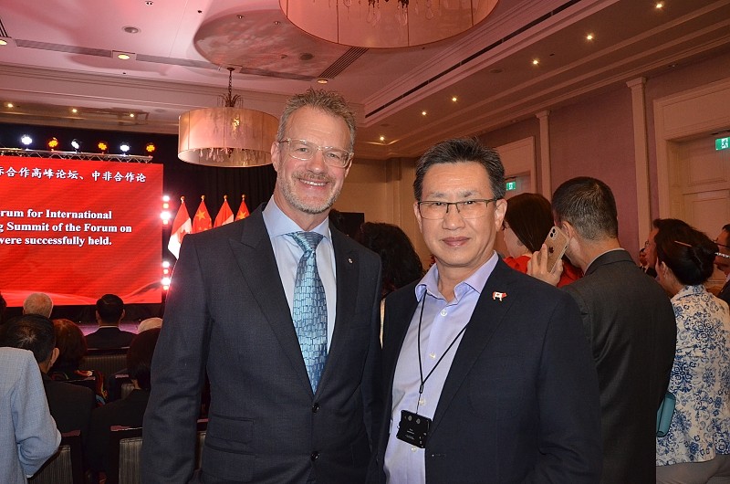 2024年9月26日,在多倫多泛太平洋酒店舉行的慶祝中國成立75週年的招待會上,林皓(右)與大山喜相逢。作者本人提供