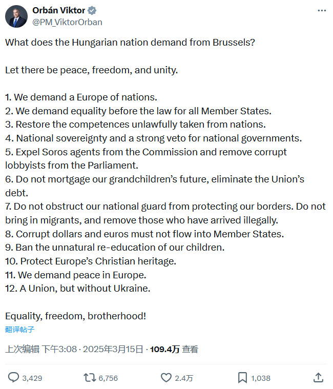 【文/觀察者網 陳思佳】據《匈牙利民族報》3月15日報道,匈牙利總理歐爾班當天在社交平台X上發文,向歐盟提出12點要求,包括所有成員國在法律面前平等、烏克蘭不加入歐盟、實現歐洲和平以及驅逐“索羅斯代理人”等,以實現“和平、自由和團結”。