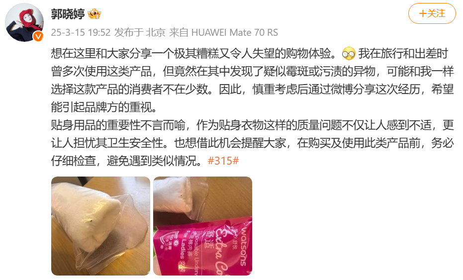 據此前報道,3月15日晚,演員郭曉婷在微博發文,稱自己曾購買的一次性內褲上出現了異物。其曬出的圖片顯示,一件白色的一次性內褲上有類似於黴斑的污漬。