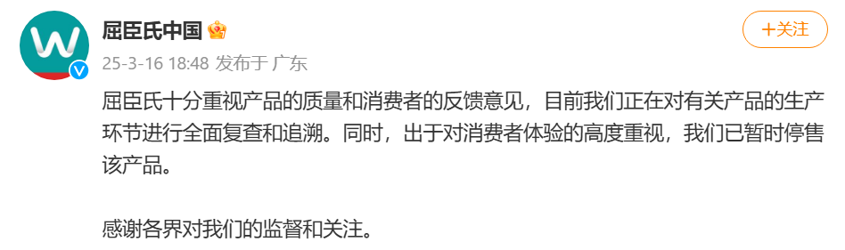 屈臣氏十分重視產品的質量和消費者的反饋意見,目前我們正在對有關產品的生產環節進行全面複查和追溯。同時,出於對消費者體驗的高度重視,我們已暫時停售該產品。
