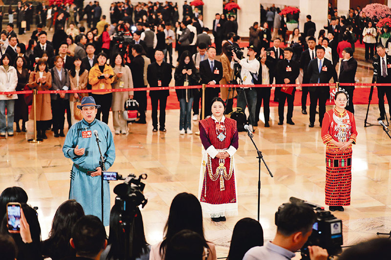 2025年3月10日,全國政協十四屆三次會議第三場“委員通道”在人民大會堂舉行。圖為少數民族委員亮相“委員通道”。 民族畫報記者 康夢婷/攝