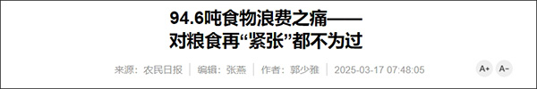 農民日報:“胖貓”事件中94.6噸食物被浪費,對糧食再緊張都不為過