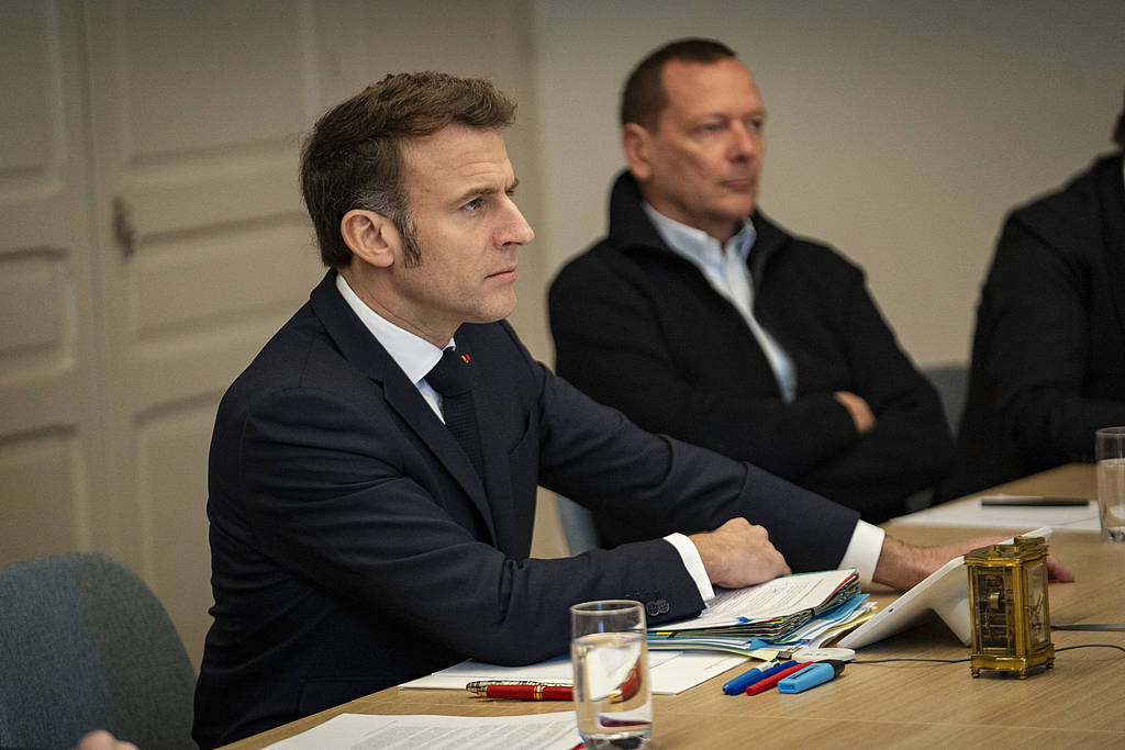 當地時間2025年3月15日,法國巴黎,馬克龍通過視頻會議參與由英國首相斯塔默組織的烏克蘭和平與安全會議 視覺中國