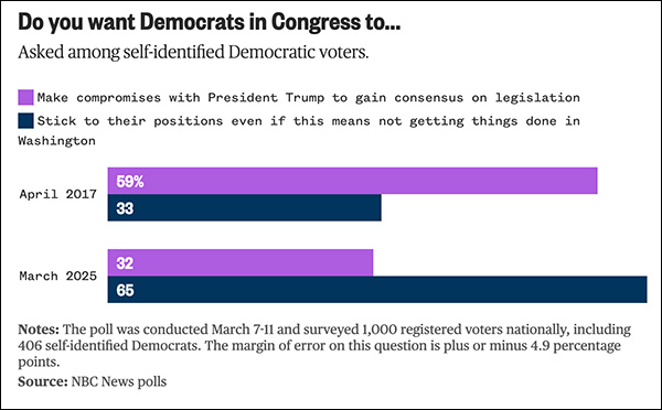 最新民調顯示,65%的民主黨支持者認為不應該向特朗普妥協,而2017年這一比例為33%。 美國國家廣播公司(NBC)民調