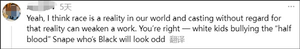 “種族在我們的世界是一個現實問題,選角不考慮現實,就會削弱一部作品。白人小孩欺負既是巫師麻瓜 ‘混血’又是黑人的斯內普會很詭異。”