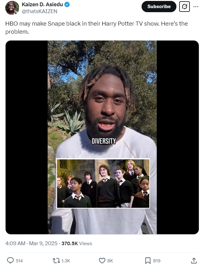 他認為,《哈利·波特》是很多人美好的童年回憶,把斯內普換成黑人可能有助於推動HBO的多元化,但代價是不忠於原著,“如果你認為種族不是斯內普這個角色的核心,我同意,但我們不能一方面説這個角色沒有明顯膚色,另一方面HBO卻強調膚色。”