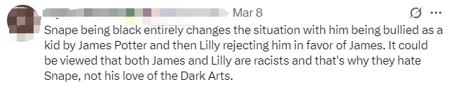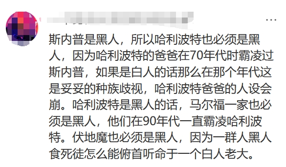 按照原著,斯內普小時候在霍格沃茲遭遇了無休止的霸凌,被哈利·波特的父親詹姆·波特等四位白人男同學欺負,如果斯內普是黑人,劇情會陡然出現“種族主義色彩”,並且讓詹姆、莉莉和斯內普的故事線都變怪了。
