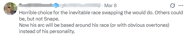“其他人可以換種族,但斯內普不行。現在他的情節將基於他的種族,而不是他的個性。”