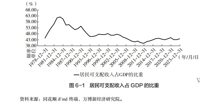 計算1978年以來的中國居民可支配收入佔GDP的比重,可以看出在20世紀80年代初曾一度達到63.00%左右的高點,此後便逐漸下行,2011年下滑至40.23%的低點,其後有所反彈,近年在43.00%~44.00%的區間內波動(見圖6-1)。