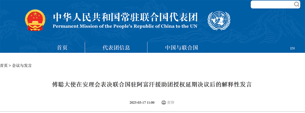 3月17日,中國常駐聯合國代表團網站發佈中國常駐聯合國代表傅聰在安理會表決聯合國駐阿富汗援助團授權延期決議後的解釋性發言,全文如下: