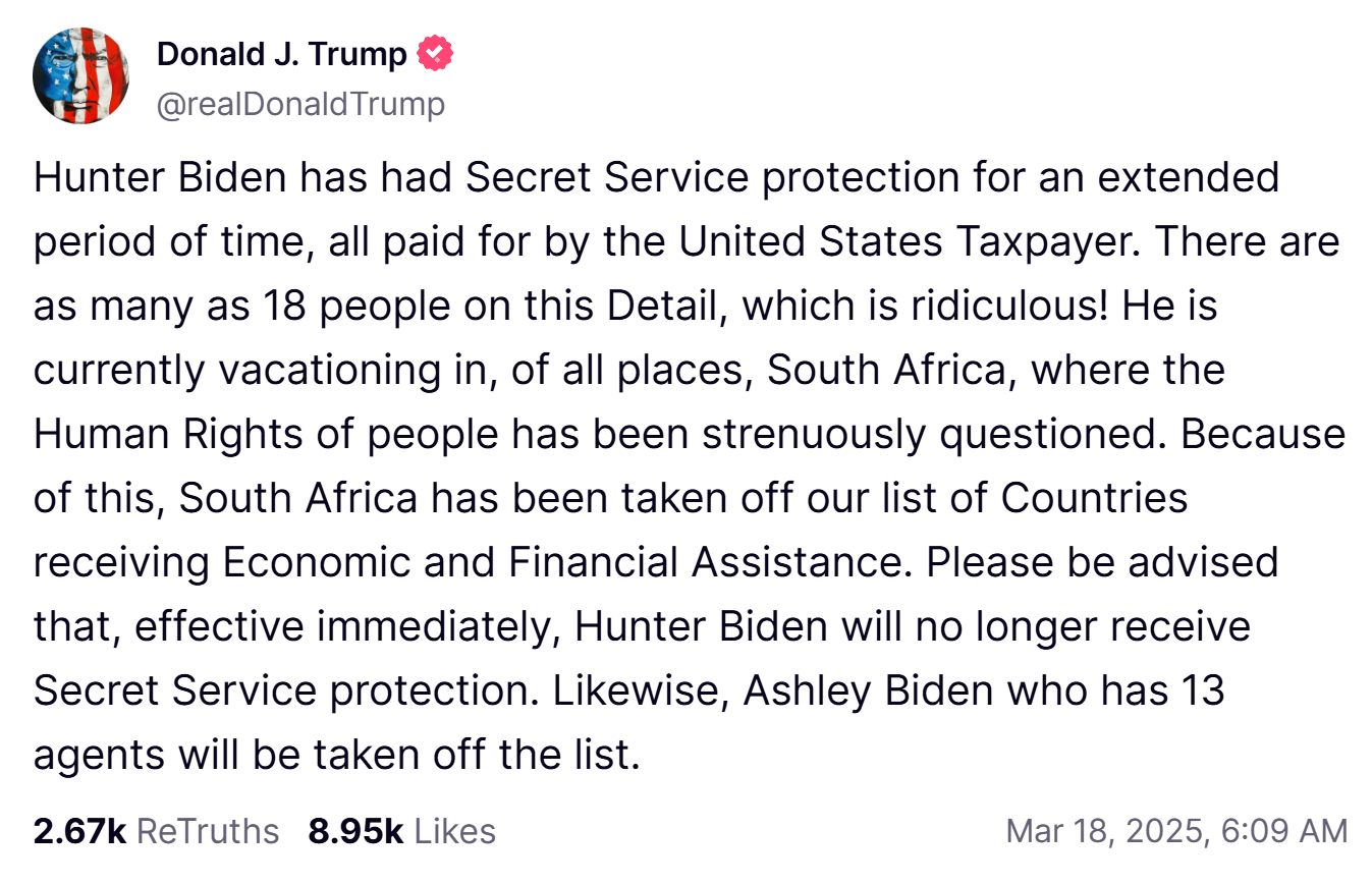 當地時間3月17日,美國總統特朗普在他自創的“真實社交”平台發文説,即日起,前總統喬·拜登的兒子亨特·拜登以及其女兒阿什莉·拜登將不再受到特勤局保護。