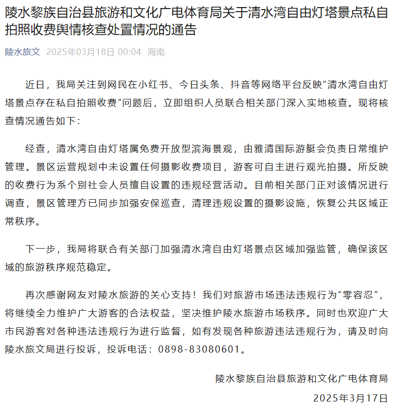 3月18日凌晨,海南陵水黎族自治縣旅遊和文化廣電體育局微信公眾號“陵水旅文”發佈關於清水灣自由燈塔景點私自拍照收費輿情核查處置情況的通告: