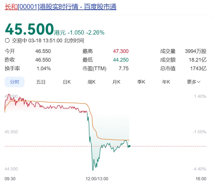 受宣佈出售港口資產後的輿論影響,長和港股在3月18日午間大幅“跳水”,跌幅超過4.4%,至午間休盤期間報收44.75港幣/股,市值一度蒸發超過78億港幣。下午股價有所回升。