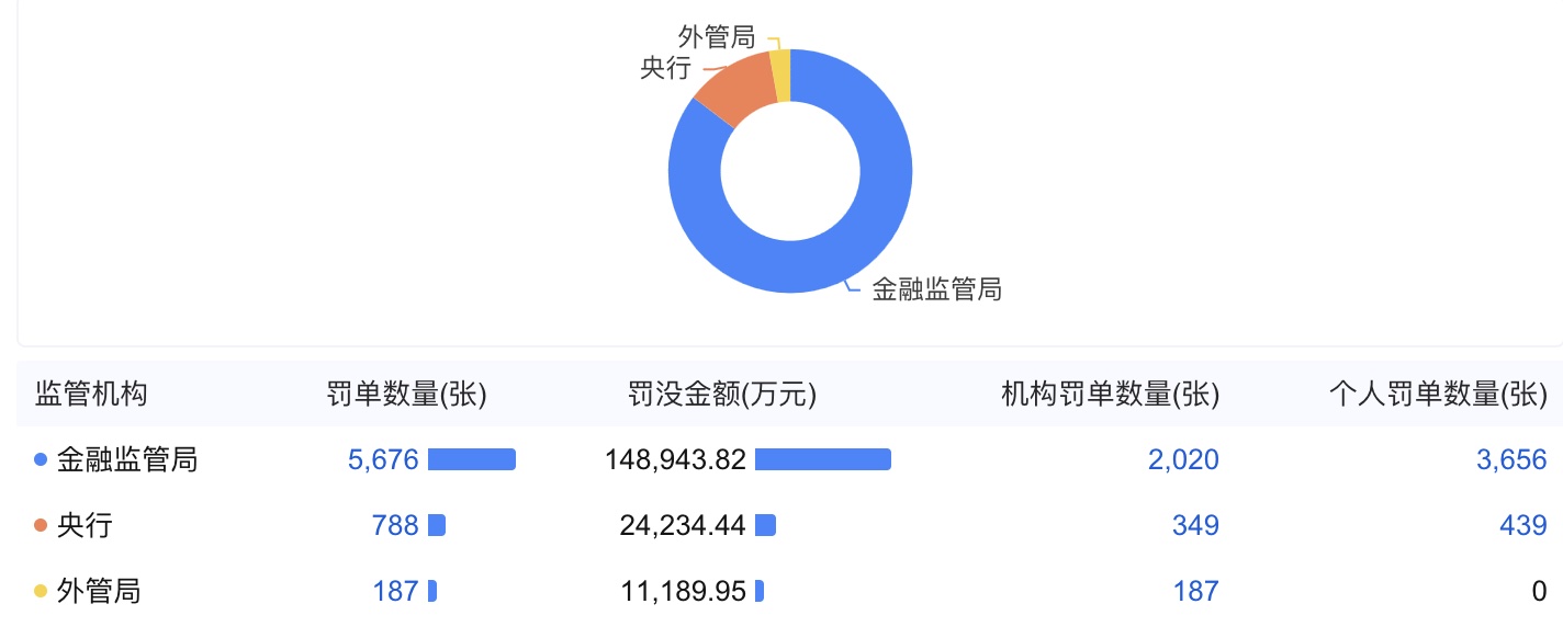 細分監管主體處罰力度,國家金融監督管理總局以5676張罰單、14.89億元罰款居首,單張平均罰款約26.23萬元;中國人民銀行緊隨其後,開出788張罰單、處以2.42億元罰款,單張平均罰款約30.71萬元,在反洗錢、信息系統安全等領域頻出重拳;國家外匯管理局則以187張罰單、1.11億元罰款收緊外匯管理紅線,單張平均罰款達59.36萬元,為三類機構中處罰力度之最。