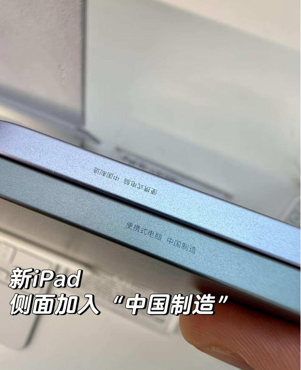 蘋果於3月4日在官網上架了新款iPad和iPad Air,於3月12日正式開售。近日,多名網友在收到產品後發現,新款iPad側面還鐫刻了“便攜式電腦 中國製造”字樣。