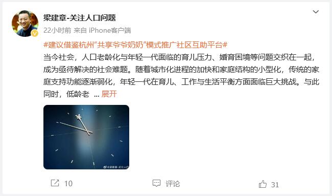 3月17日,攜程創始人梁建章就在微博發佈長文稱,“共享爺爺奶奶”模式社區互助項目,在緩解年輕人育兒壓力、促進代際融合和提升老年人社會參與度方面具有重要意義。建議推廣“共享爺爺奶奶”模式,降低育兒成本,為年輕人減輕負擔,為老年人創造價值,讓“社區互助平台”成為社會和諧發展新亮點。