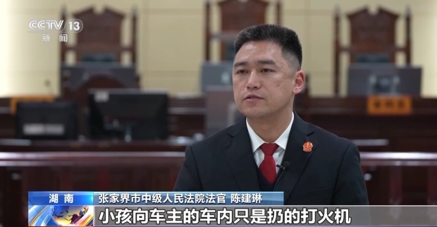 **桑植縣人民法院瑞塔鋪人民法庭庭長梁婷:**被告的小孩從車輛對面的馬路邊走往車輛途中,一直有點和丟的動作,在小孩走到起火車輛前部位置時,依然往車輛內丟放了一個鞭炮。