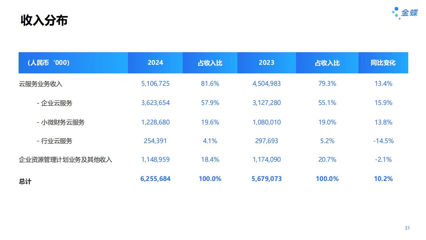 財報數據顯示,2024年金蝶國際全年收入62.56億元,同比增長10.2%;其中雲服務收入佔比提升至81.6%,經營性現金流同比激增42.9%至9.34億元。