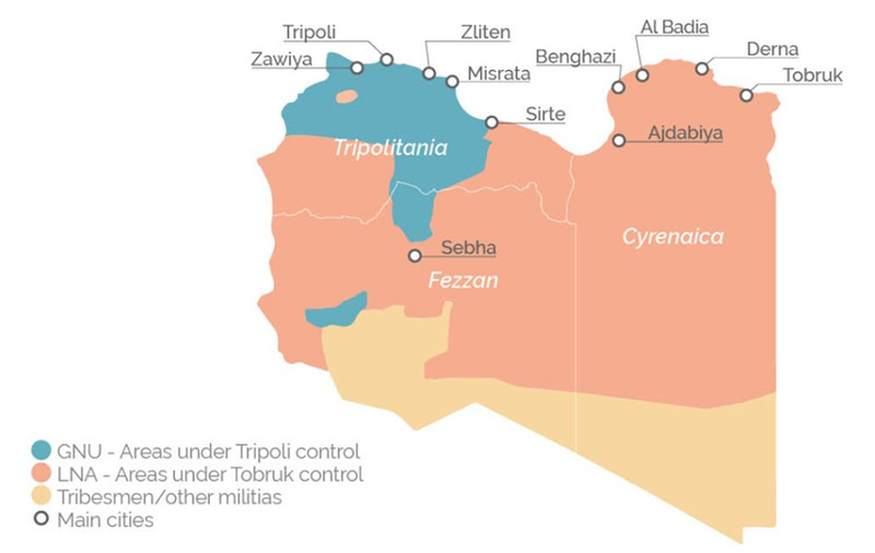 目前,利比亞的國內局勢依然被割裂:位於的黎波里、得到國際社會廣泛承認的民族團結政府(GNA),以及哈利法·哈夫塔爾(Khalifa Haftar)領導下、控制了東部地區的利比亞國民軍(LNA)。這樣的對立讓外部勢力能夠利用利比亞的不穩定來服務他們自身的區域議程。